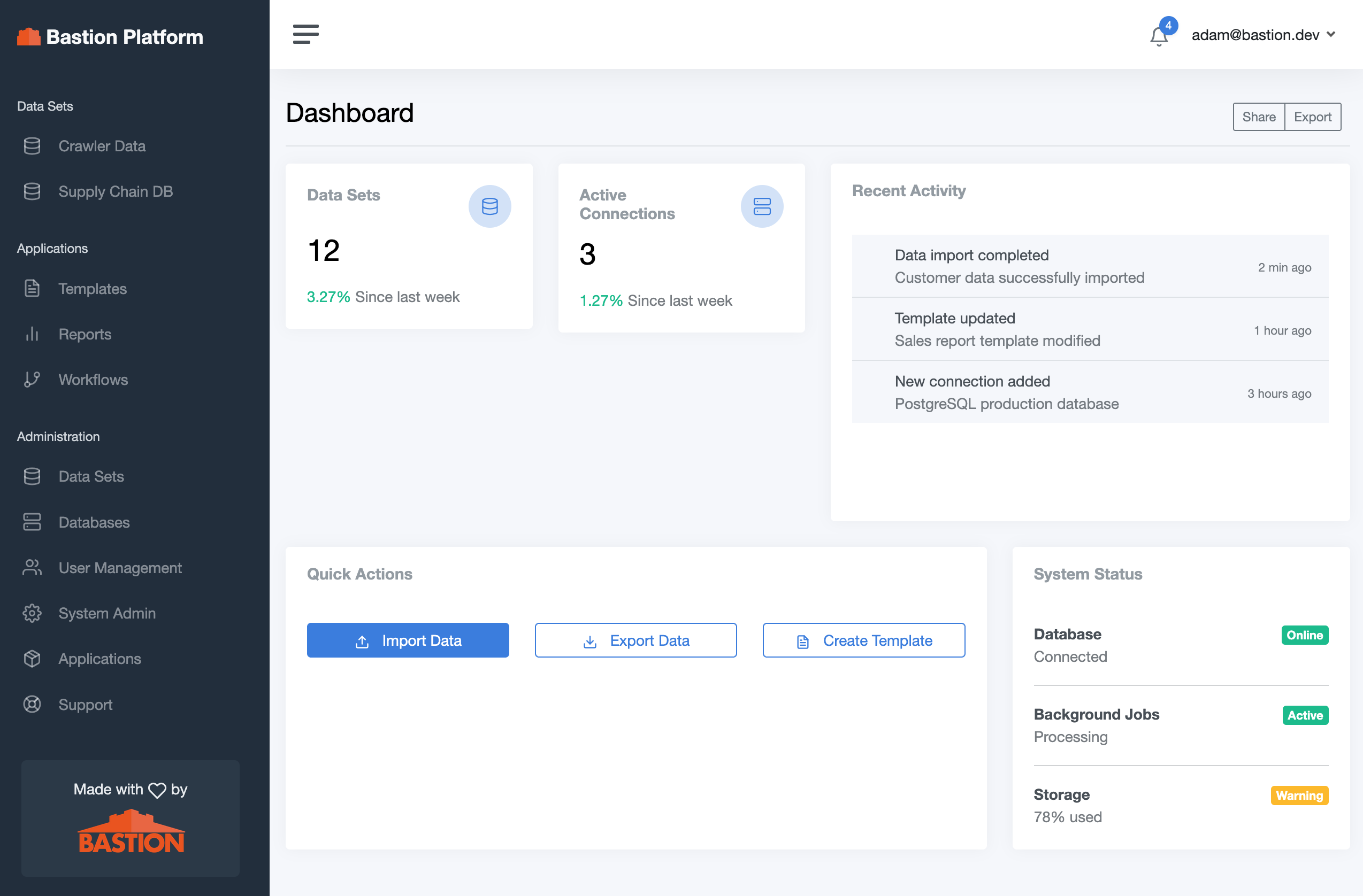 A RESTful API lets you integrate Bastion with any external system. Deploy custom React applications directly on the platform and use the built-in CMS to publish public-facing data and reports.